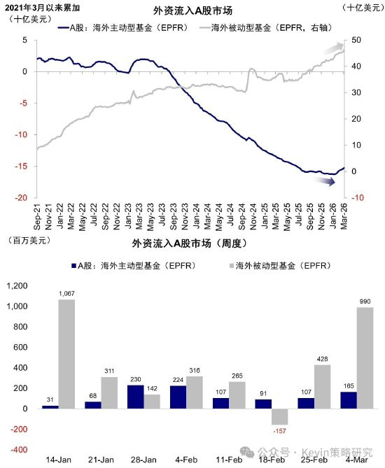 1⃣EPFR口径(截至周三),主动外资流出港股36万美元(vs.上周流入2.6亿)、终结了七周流入,流入A股1.7亿美元(vs.上周1.1亿)。