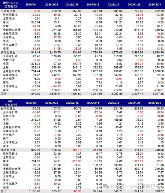 港股被动外资流入降至18.5亿美元(vs.上周24.4亿),流入A股9.9亿美元(vs.上周流出4.3亿)。