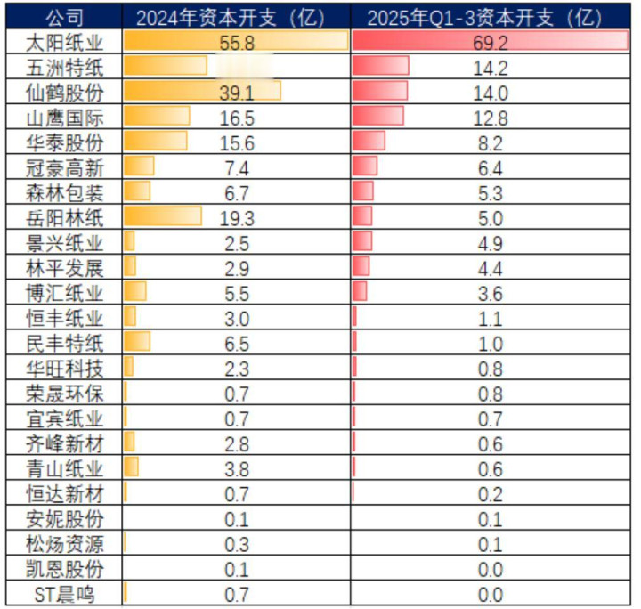 持续盈利的能力,也给了太阳纸业逆周期扩产的底气。近两年来,公司的资本开支在同行中始终遥遥领先。