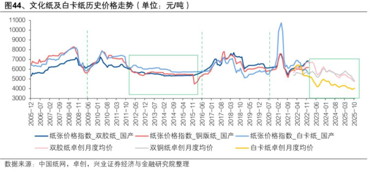但一个好消息是,2025年末头部纸企纷纷释放提价意愿。太阳纸业就在11月、12月连发两封文化纸提价函,合计涨价400元/吨。按照均价计算,涨价幅度约8%-9%。