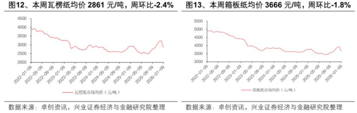 从纸种价格走势来看,根据卓创资讯,2025年四季度箱板纸、瓦楞纸均价分别为3,809元、3,091元/吨,分别环比增长307元、447元/吨,包装纸已经率先企稳。
